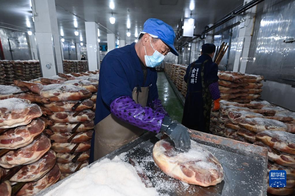 臨近新春佳節,浙江省金華市的火腿企業(yè)開(kāi)足馬力生產(chǎn)金華火腿,作為特色年貨供應節日市場(chǎng)。