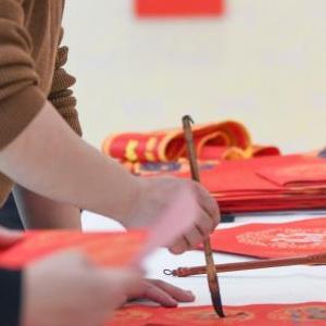 1月4日,在新疆圖書(shū)館主會(huì )場(chǎng)內,書(shū)法家(左)為市民寫(xiě)春聯(lián)。