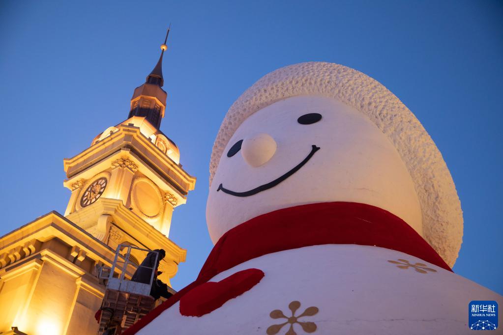 1月4日,在哈爾濱松花江畔,工人進(jìn)行大雪人收尾工作。