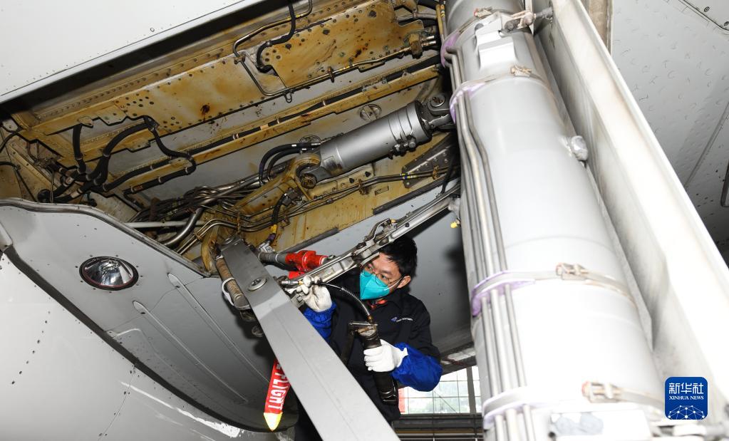 春運將至,航空公司組織工程師加強飛機檢修維護工作,保障旅客出行安全。