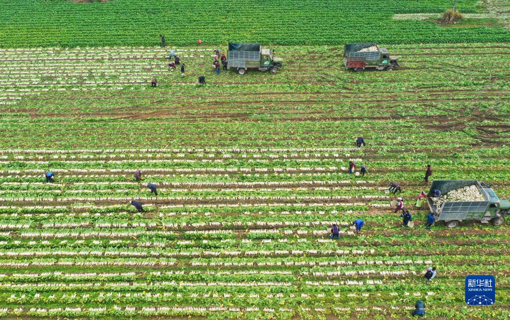 1月5日,在湖南省衡陽(yáng)縣關(guān)市鎮鑫粵農業(yè)生態(tài)蔬菜種植基地,村民將采收的蘿卜裝車(chē) (無(wú)人機照片)。