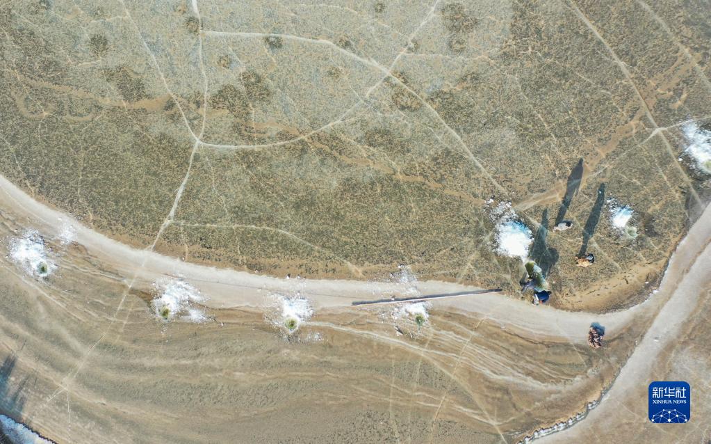 1月5日,達拉特旗樹(shù)林召鎮的村民在魚(yú)塘冰面上作業(yè)(無(wú)人機照片)。