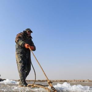 冬日時(shí)節,內蒙古達拉特旗樹(shù)林召鎮的村民在結冰的魚(yú)塘上鑿冰、拉網(wǎng),捕撈人工養殖的“黃河魚(yú)”,以備春節前夕上市。達拉特旗位于黃河“幾”字彎,人工養殖的“黃河魚(yú)”是當地的一大特色。