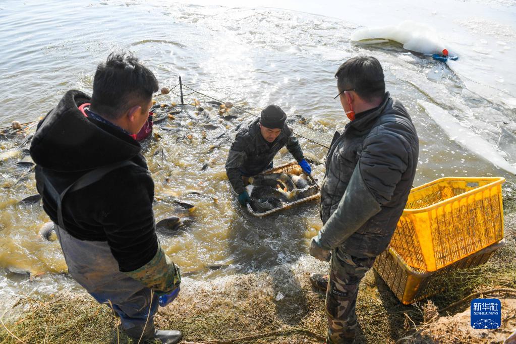 1月5日,達拉特旗樹(shù)林召鎮的村民在魚(yú)塘中捕魚(yú)。