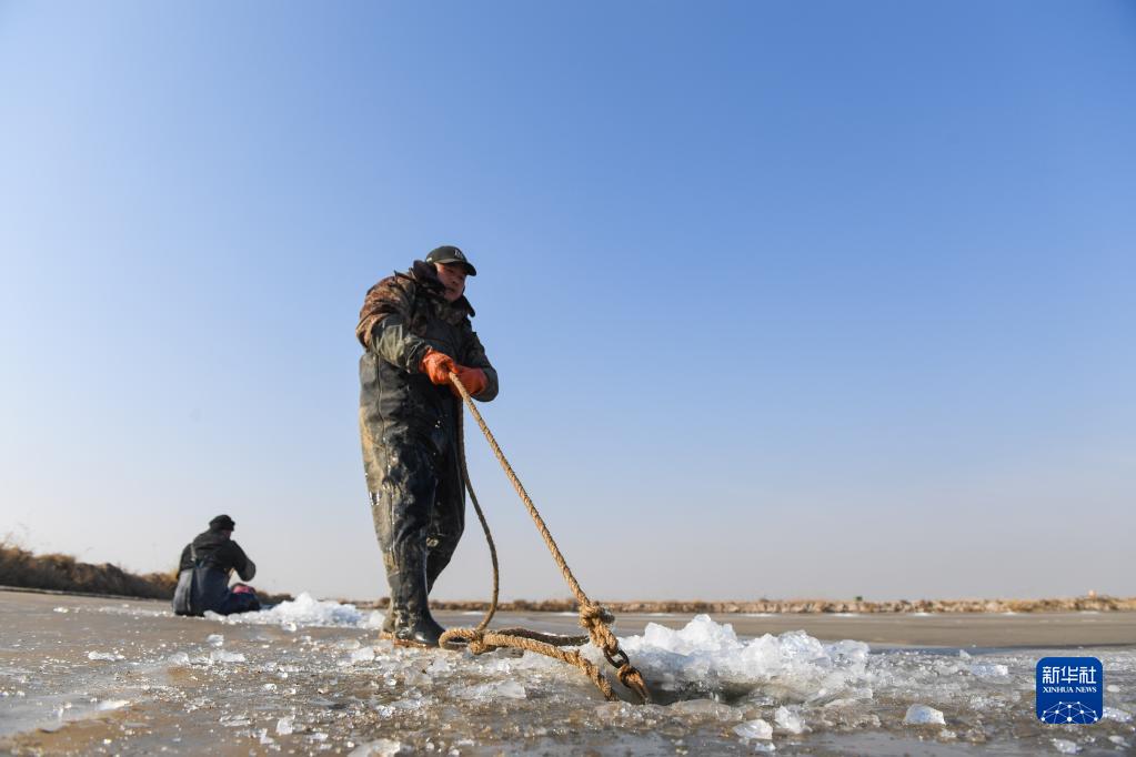 1月5日,達拉特旗樹(shù)林召鎮的村民在魚(yú)塘冰面上作業(yè)。