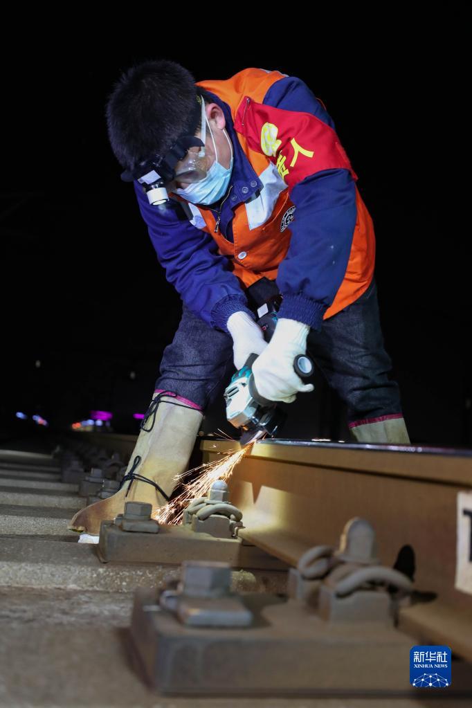 1月6日凌晨,在滬昆高鐵貴州銅仁南站站區,貴陽(yáng)高鐵工務(wù)段銅仁南線(xiàn)路檢查工區的工作人員用角磨機對鋼軌進(jìn)行修理。