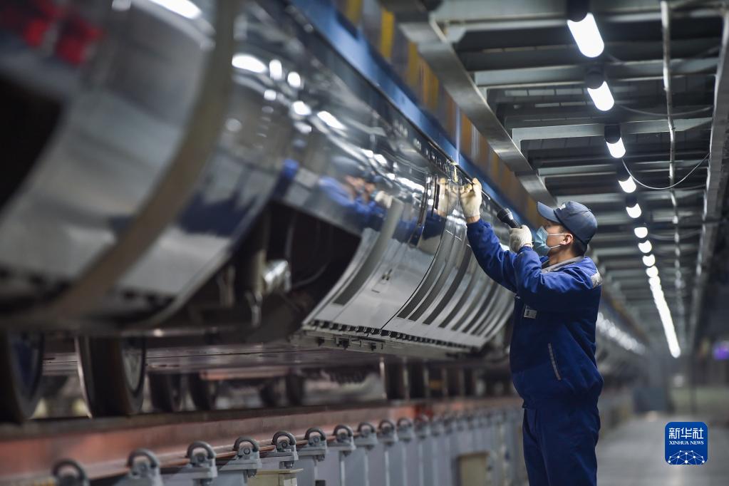 1月6日,在南京動(dòng)車(chē)段南京南動(dòng)車(chē)運用所檢修庫,地勤機械師在檢修動(dòng)車(chē)車(chē)體。