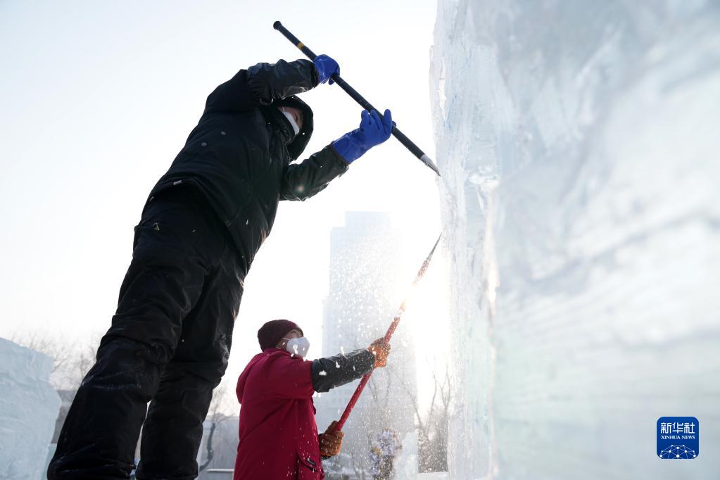 1月6日,在哈爾濱冰燈藝術(shù)游園會(huì )園區,冰雕師在進(jìn)行冰雕作品創(chuàng )作。