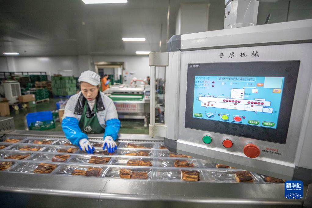 1月4日,在重慶市城口縣坪壩鎮新華村重慶美綴美食品有限公司,工人在外包裝車(chē)間利用自動(dòng)打包機封裝臘肉。
