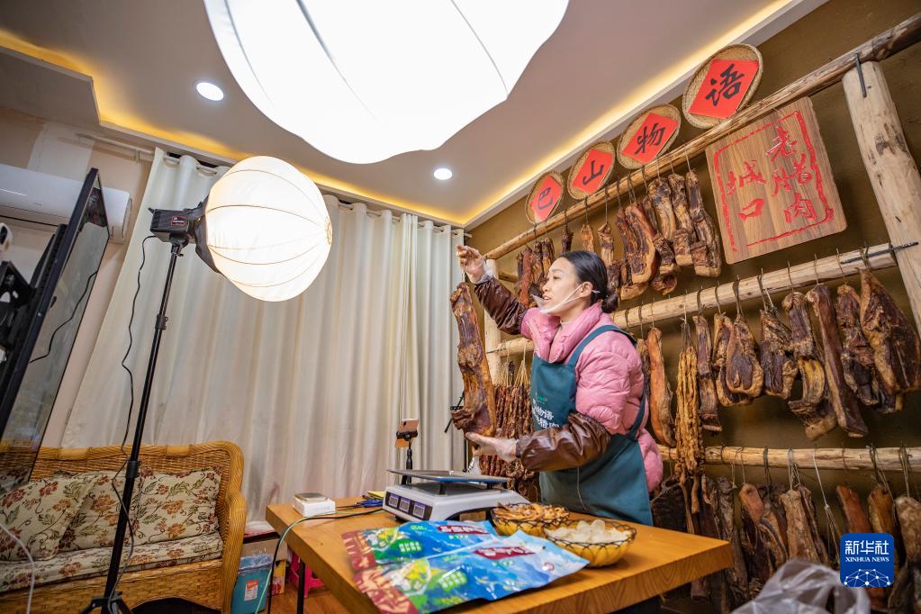 1月4日,在重慶市城口縣巴山物語(yǔ)電商超市,主播向直播間的觀(guān)眾展示推銷(xiāo)城口臘肉。