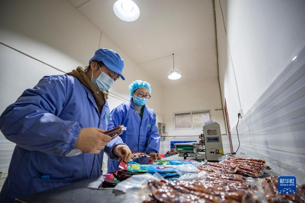 1月4日,在重慶市城口縣厚坪鄉白鶴村,重慶巴山物語(yǔ)食品加工有限公司的工作人員在打包即將發(fā)貨的香腸。