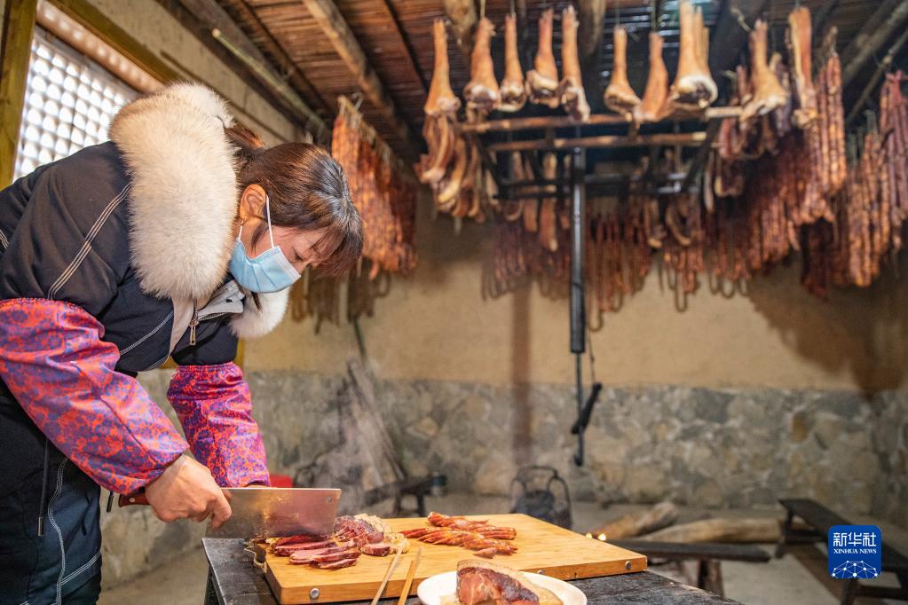 1月4日,在重慶市城口縣厚坪鄉紅色村,村民何宜香將煮好的城口老臘肉切片。
