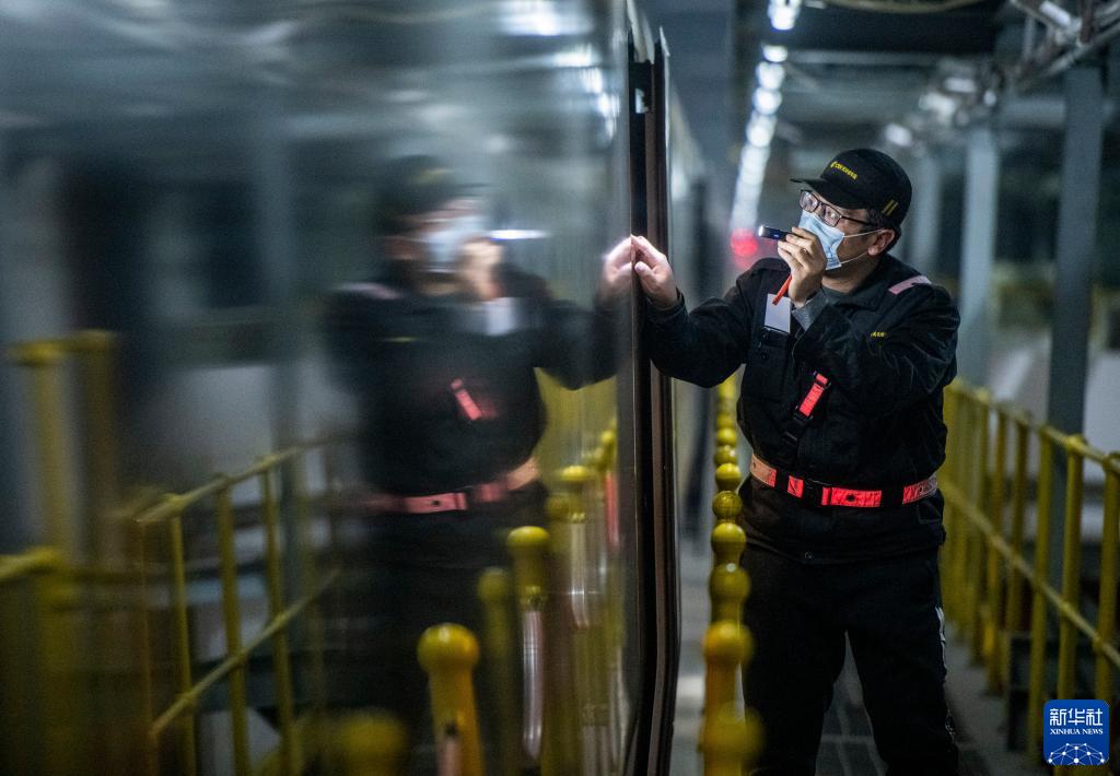 1月6日,地勤機械師在檢查動(dòng)車(chē)組車(chē)體外觀(guān)狀態(tài)。