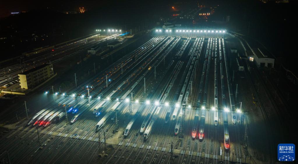 1月7日,2023年春運啟動(dòng)。當日凌晨,??吭诤祥L(cháng)沙動(dòng)車(chē)運用所的動(dòng)車(chē)組列車(chē)排列整齊,如同一支“陸地艦隊”。
