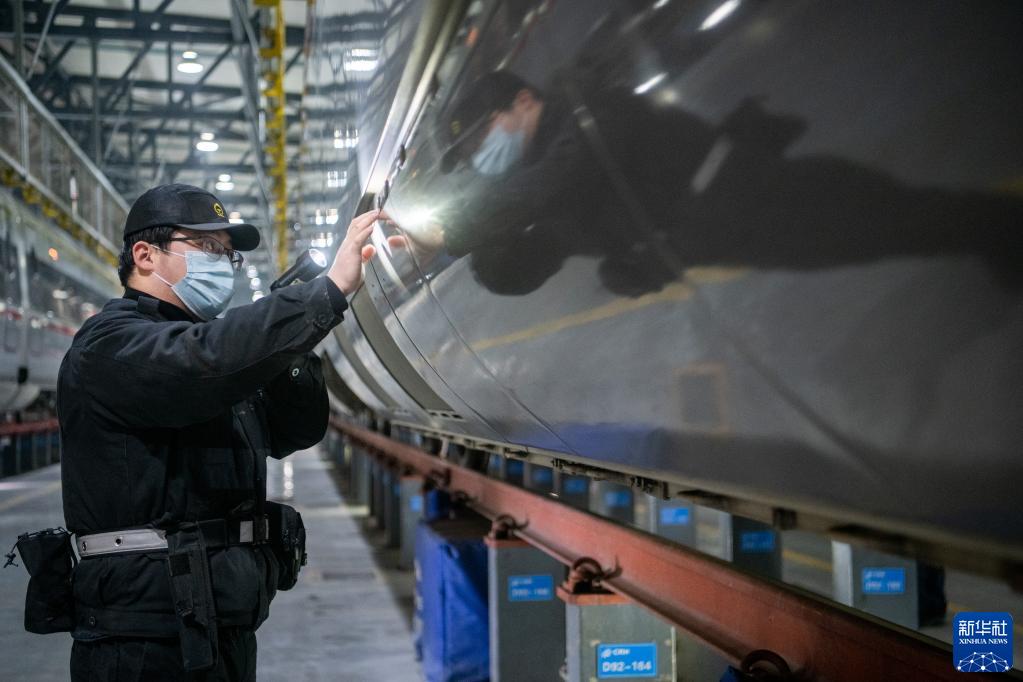1月6日,地勤機械師在檢查動(dòng)車(chē)組列車(chē)車(chē)體外觀(guān)狀態(tài)。