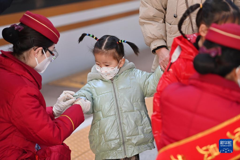1月7日,在天津西站,工作人員幫一名小朋友佩戴有列車(chē)信息的手環(huán)防止走失。