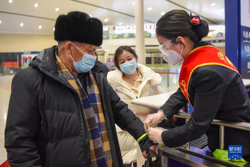 1月7日,在烏魯木齊站候車(chē)大廳,工作人員為老年乘客系上“綠絲帶”,為旅客提供優(yōu)先進(jìn)站、協(xié)助乘降、便利出站等服務(wù)。