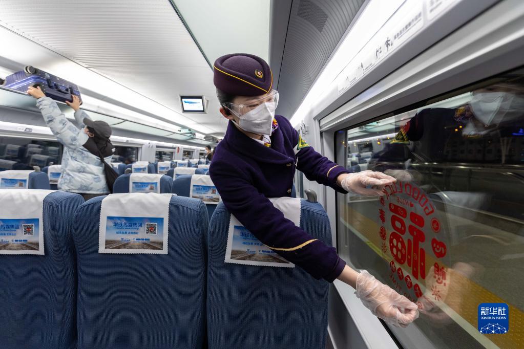 1月7日,在上海虹橋火車(chē)站,上??瓦\段乘務(wù)員在G4831次春運臨客列車(chē)上貼“?!弊?。