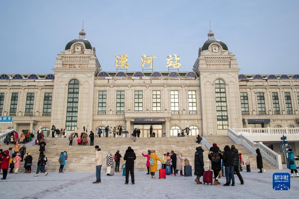 1月7日,旅客在黑龍江漠河火車(chē)站外。