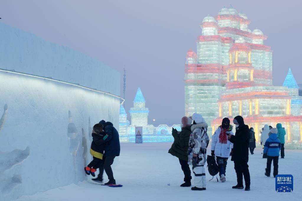 1月6日,游客在哈爾濱冰雪大世界園區的雪墻前游玩、拍照。