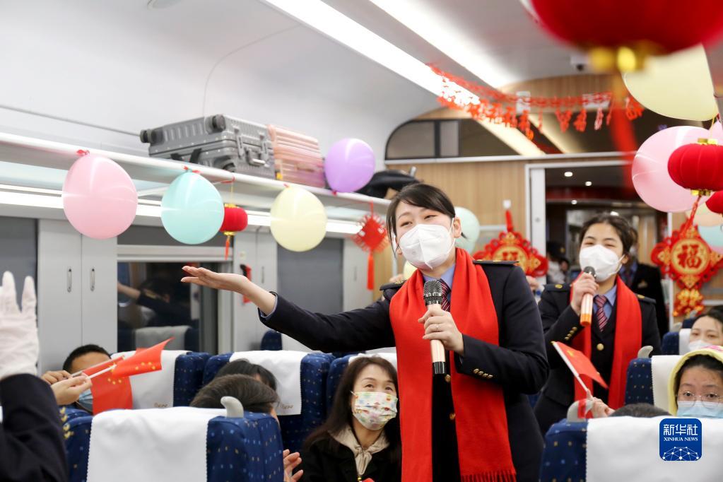 春運首日,在北京豐臺開(kāi)往福州的D759次列車(chē)上,擔任乘務(wù)工作的中國鐵路南昌局集團有限公司福州客運段福京車(chē)隊的黨團員、青年骨干組成志愿者服務(wù)隊為旅客表演文藝節目、開(kāi)展互動(dòng)游戲,讓春運旅途充滿(mǎn)歡歌笑語(yǔ)。