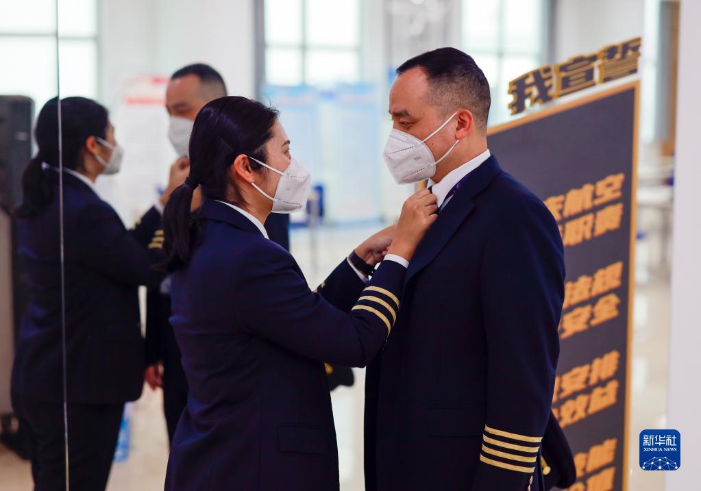 1月6日,重慶航空的機組工作區內,楊靜(左)在給丈夫菅士博(右)整理領(lǐng)帶。