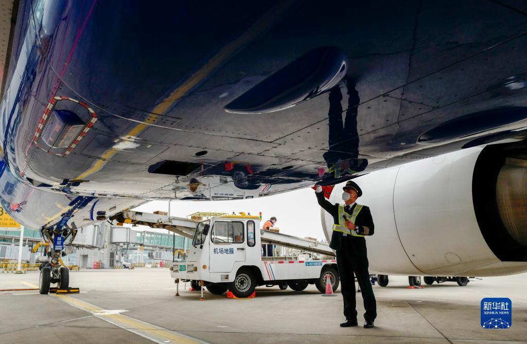 1月6日,重慶江北國際機場(chǎng)的停機坪上,機長(cháng)菅士博對客機進(jìn)行起飛前的繞機檢查。