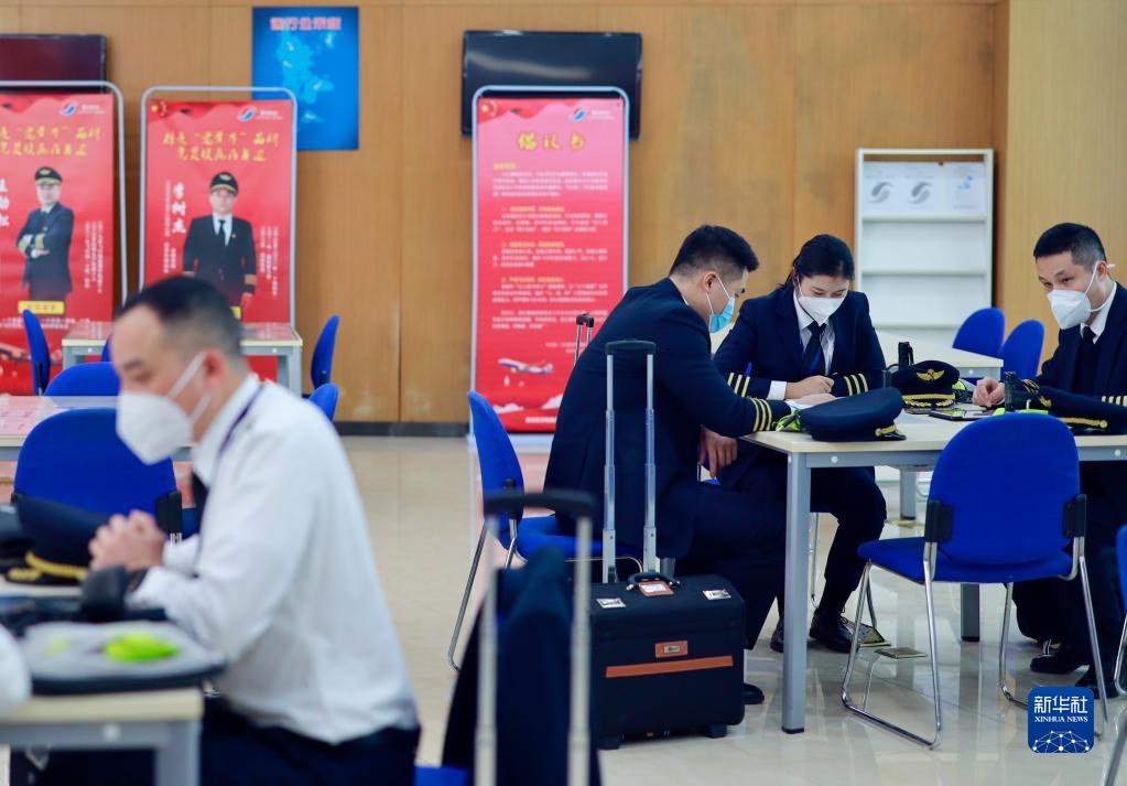 1月6日,重慶航空的機組工作區內,楊靜(右二)和丈夫菅士博(左一)在不同機組進(jìn)行飛行前的準備。