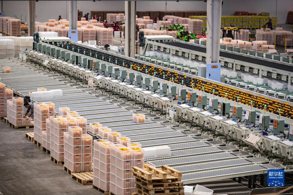 1月6日,在中國三峽柑橘(奉節臍橙)交易中心,全自動(dòng)分揀線(xiàn)將臍橙自動(dòng)分揀裝筐。