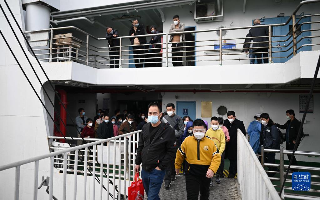 1月7日,在廣東徐聞的粵海鐵路輪渡北港碼頭,粵海鐵1號輪渡上的旅客下船登陸。