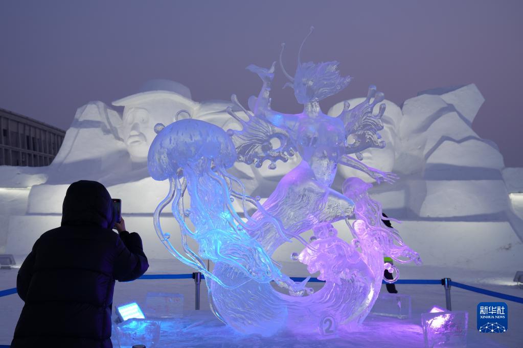 1月6日,在哈爾濱冰雪大世界園區內,游客拍攝冰雕作品《舞者》。