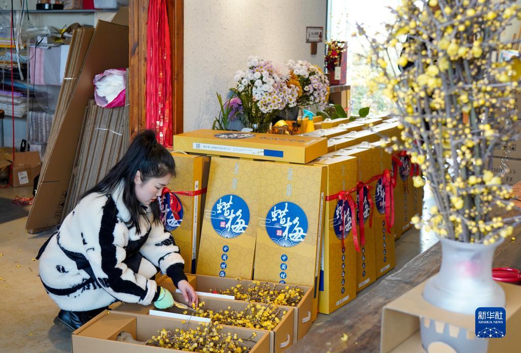 1月7日,在重慶市北碚區靜觀(guān)鎮一家創(chuàng )意工坊,一名插花師將臘梅花裝入快遞盒。
