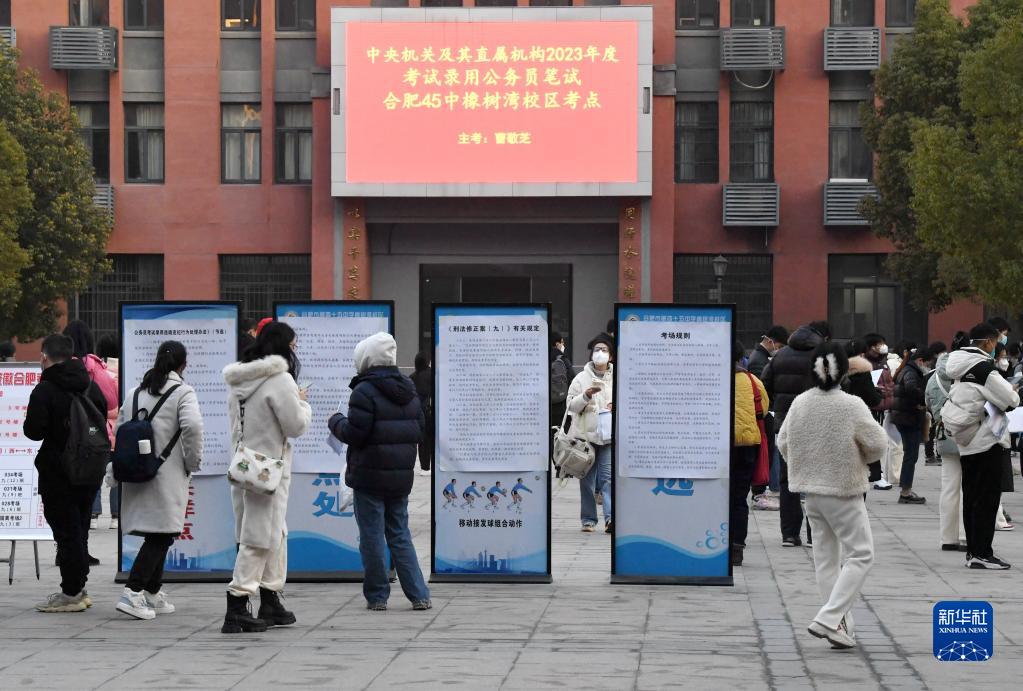當日,中央機關(guān)及其直屬機構2023年度考試錄用公務(wù)員公共科目筆試舉行。 這是1月8日,在安徽省合肥市第四十五中學(xué)橡樹(shù)灣校區考點(diǎn),考生準備入場(chǎng)參加公共科目筆試。