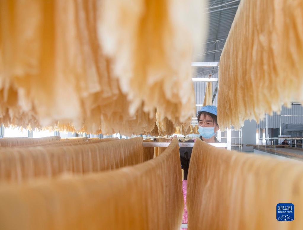1月8日,在湖南省永州市江華瑤族自治縣涔天河鎮一家腐竹加工廠(chǎng),工人在晾曬腐竹。