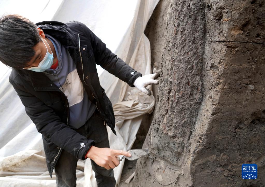 考古工作人員在河南商丘宋國故城遺址發(fā)掘現場(chǎng)清理永定柱四周夯土(1月6日攝)。