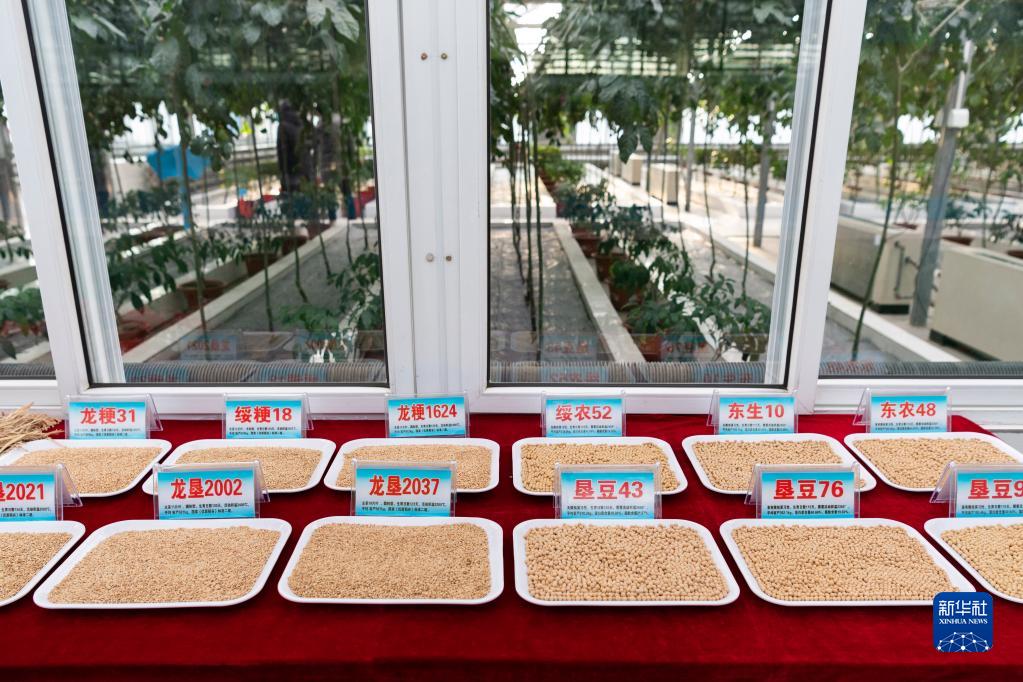 這是北大荒建三江國家農業(yè)科技園區內展示的水稻和大豆品種(1月9日攝)。
