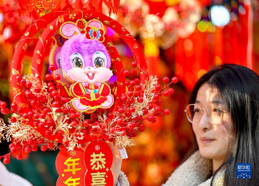 1月9日,市民在安徽省亳州市譙城區一家年貨市場(chǎng)選購新春飾品。