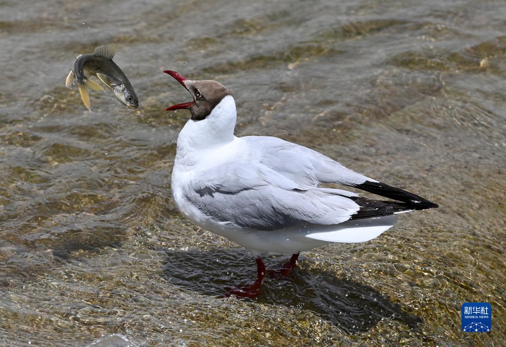 2022年6月30日,在青海省海北藏族自治州剛察縣泉吉河內,一只棕頭鷗捕捉躍起的湟魚(yú)。盛夏時(shí)節是青海湖湟魚(yú)洄游高峰時(shí)期。