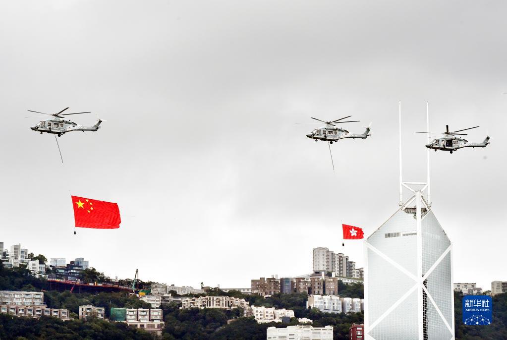 2022年7月1日,香港特區政府在金紫荊廣場(chǎng)舉行升旗儀式,慶祝香港回歸祖國25周年。這是分別懸掛中華人民共和國國旗、香港特區區旗的直升機從空中飛過(guò)。