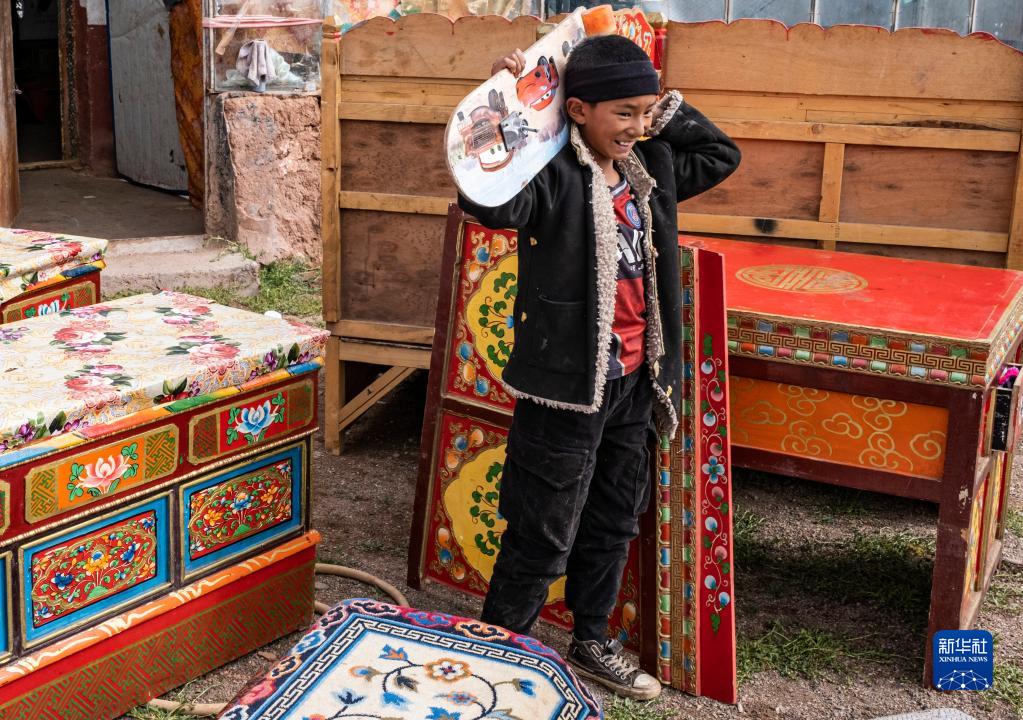 2022年7月13日,雙湖縣多瑪鄉仲魯瑪村的一個(gè)小朋友拿著(zhù)自己心愛(ài)的滑板,準備搬去新家。