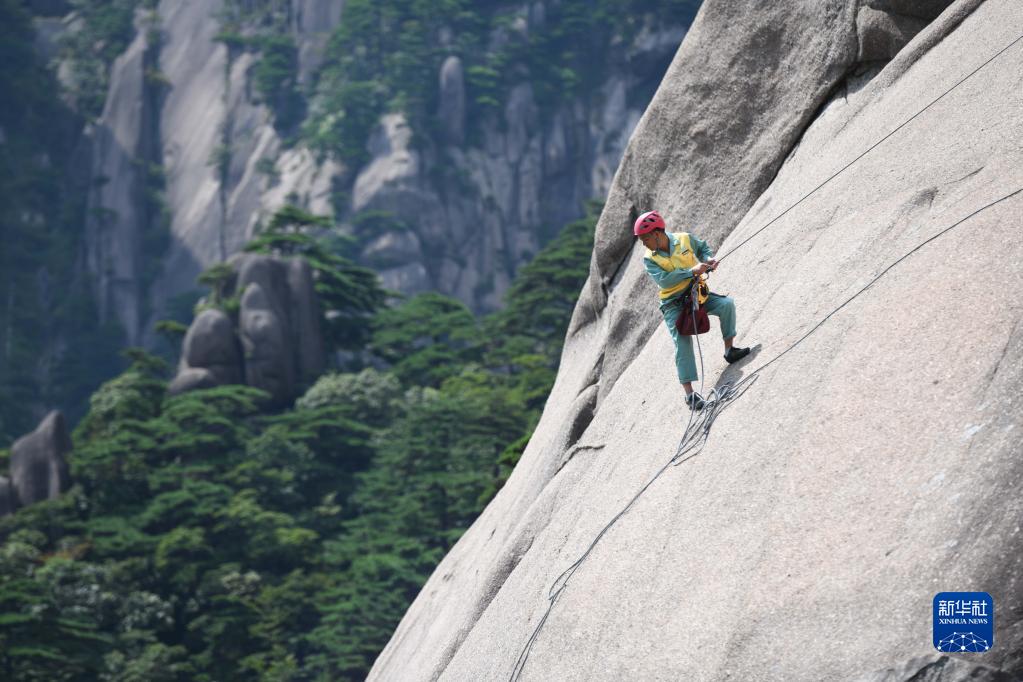 2022年8月14日,李培生在黃山風(fēng)景區的懸崖峭壁間清撿垃圾。