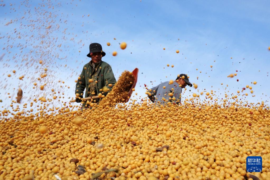 2022年10月20日,在北大荒農墾集團有限公司北安分公司趙光農場(chǎng)有限公司,工作人員在一處曬場(chǎng)的大豆堆上忙碌。