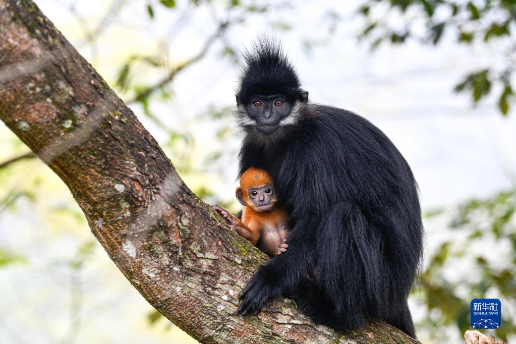這是2022年3月16日在貴州麻陽(yáng)河國家級自然保護區拍攝的黑葉猴及幼崽。新出生的黑葉猴寶寶毛色呈金黃色,幾個(gè)月后其毛色將逐漸變成黑色。