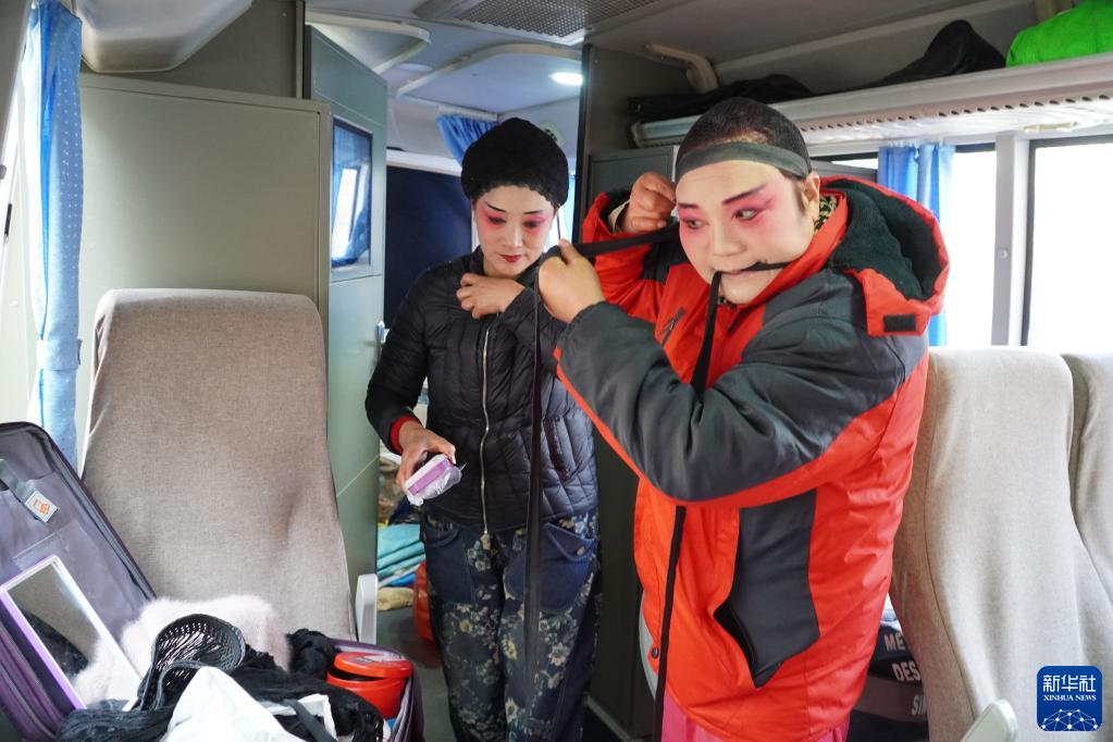 1月9日,在山東省鄆城縣黃集鎮,鄆城縣文化館戲曲演員聶香芝(右)在面包車(chē)內的臨時(shí)化妝間化妝。