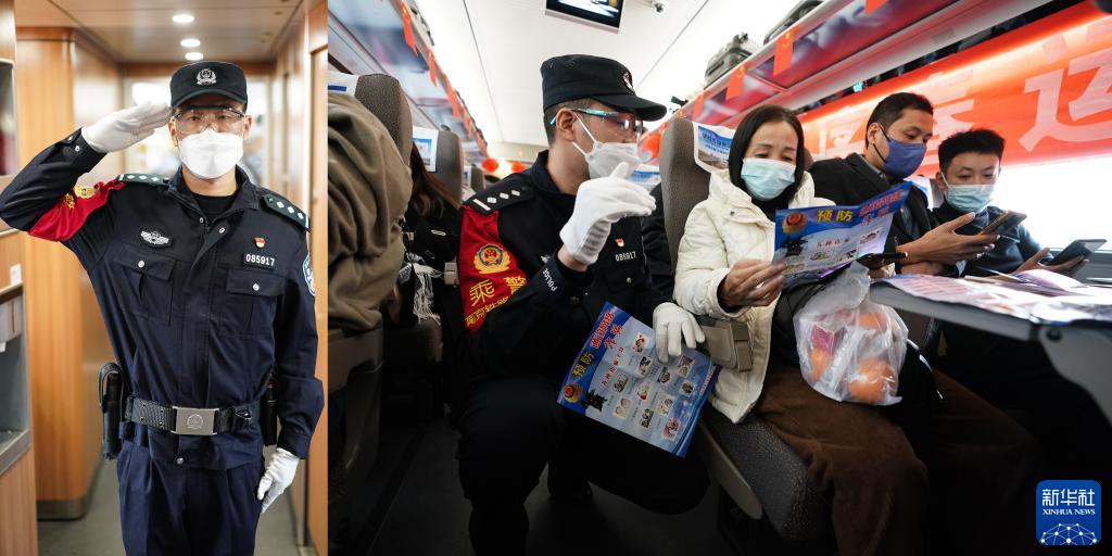 左圖:乘警于慶良在工作間隙留影;右圖:于慶良在列車(chē)上向旅客進(jìn)行反詐宣傳(拼版照片,1月9日攝)。于慶良說(shuō),作為乘警,保護旅客生命財產(chǎn)安全,護送他們順順利利回家,是使命所在。