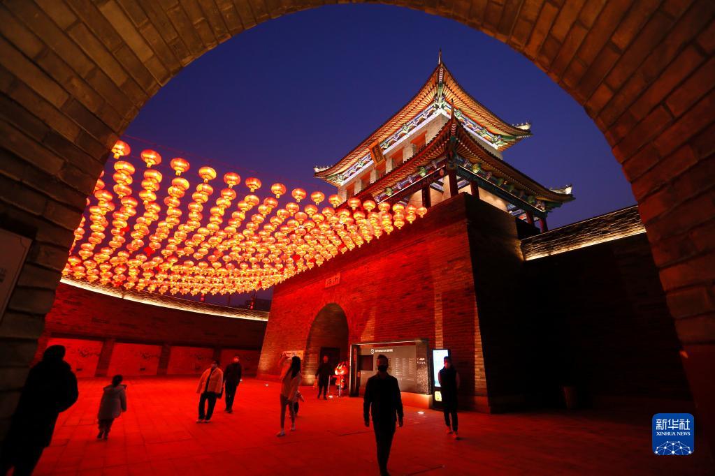 1月8日晚,游客在山東省青島市即墨古城游覽。