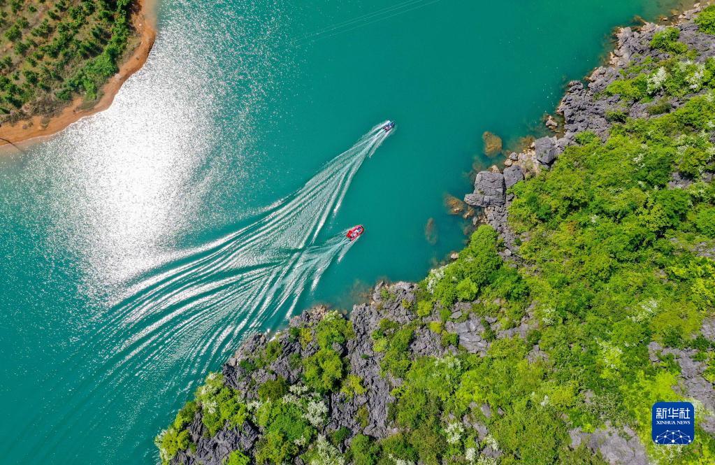 2022年4月21日,在湖南省永州市道縣壽雁鎮樂(lè )海水庫,護水志愿者乘坐快艇進(jìn)行水上巡查作業(yè)(無(wú)人機照片)。4月22日是世界地球日。近年來(lái),越來(lái)越多人用實(shí)際行動(dòng)來(lái)保護環(huán)境,珍愛(ài)地球。