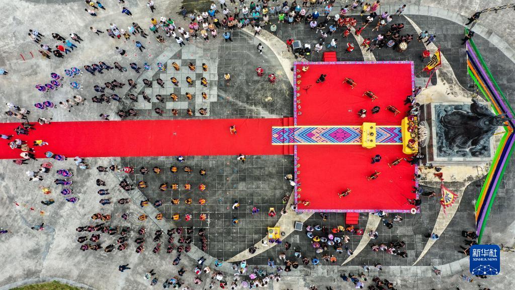 2022年6月24日,廣西大化瑤族自治縣瑤族群眾在祭祀布努瑤始祖“密洛陀”(無(wú)人機照片)。