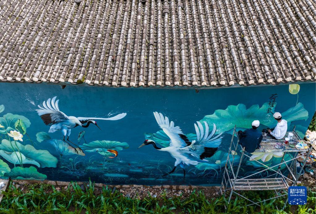 2022年6月24日,“95后”公益墻繪師劉志誠(右)在云南省麗江市永勝縣三川鎮進(jìn)行墻繪創(chuàng )作(無(wú)人機照片)。他在家鄉程海鎮、三川鎮的多個(gè)村子里畫(huà)了20多幅不同主題的墻繪,給村莊增添了斑斕色彩,吸引了不少游客前來(lái)“打卡”。