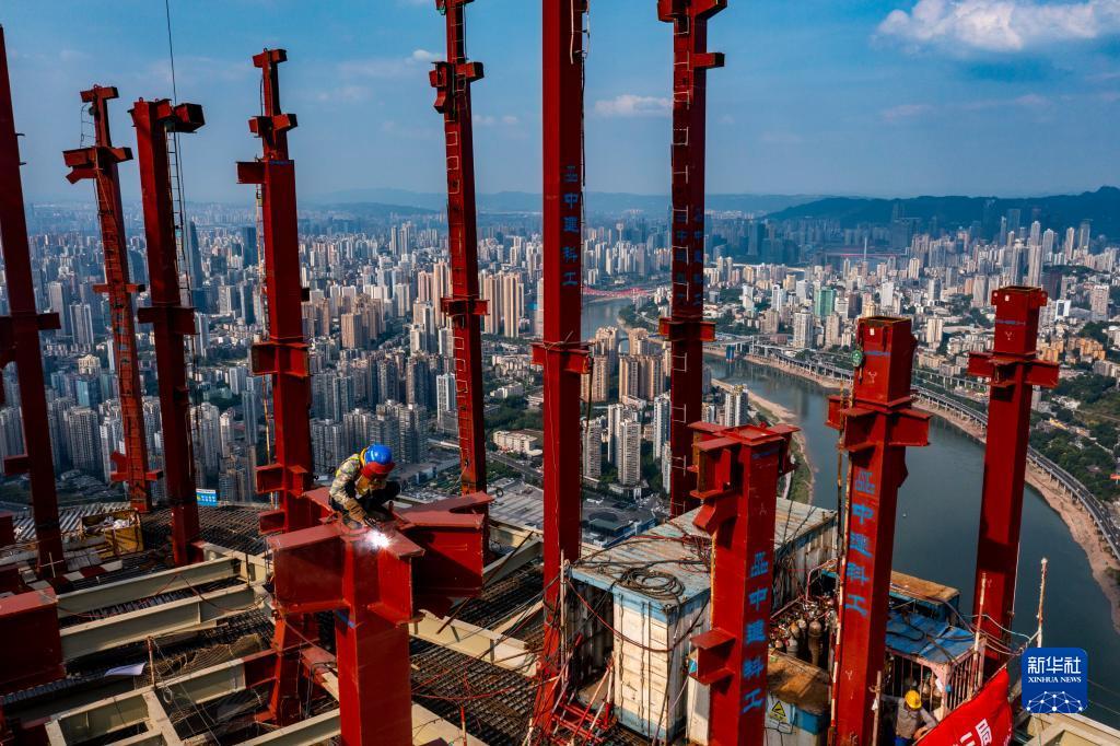 2022年7月13日,施工人員在重慶陸海國際中心項目主塔樓樓頂進(jìn)行焊接作業(yè)(無(wú)人機照片)。
